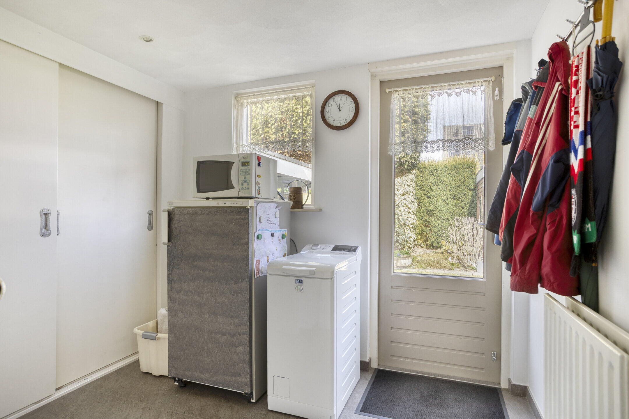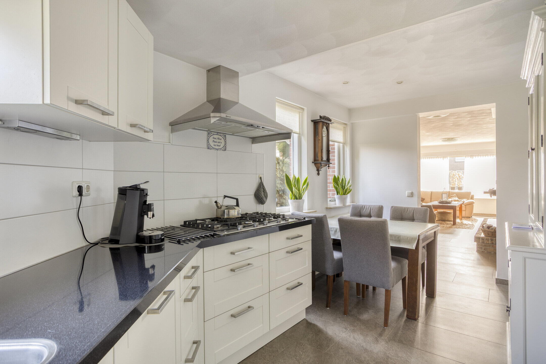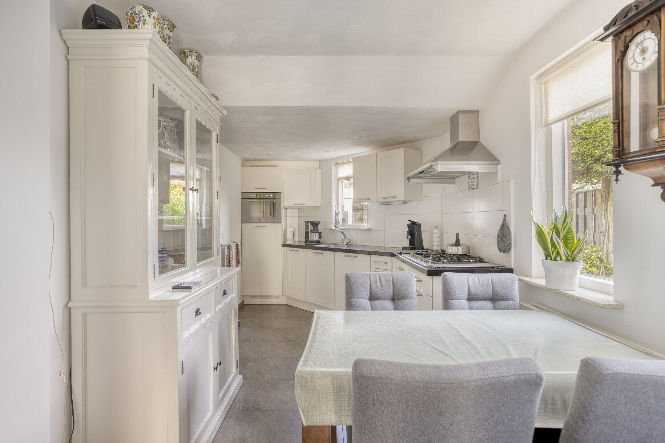 De keuken bevindt zich in de aanbouw en is geplaatst in een praktische opstelling en voorzien van een koelkast, combi-oven/magnetron, 5-pits gaskookplaat, afzuigkap, vaatwasser en een composiet werkblad. Vanuit de keuken is er toegang tot de garage en tot de praktische bijkeuken met vaste kasten, witgoedaansluitingen en een deur naar de tuin.