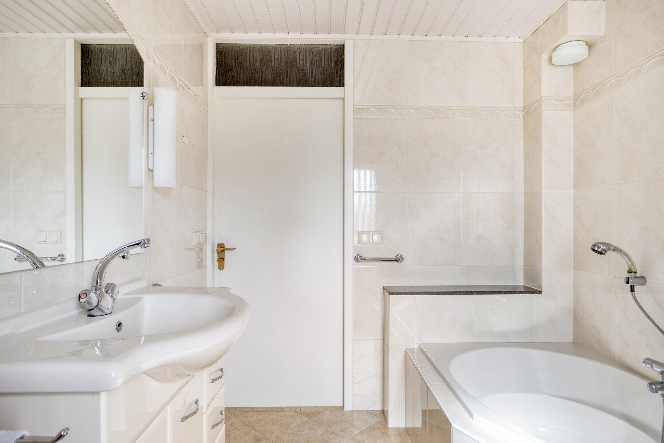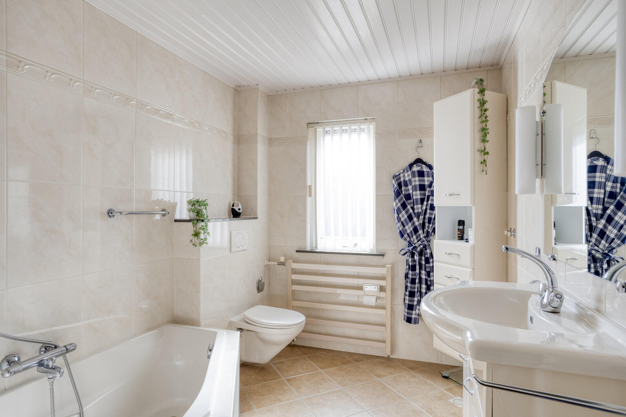 De badkamer is voorzien van een ligbad, toilet, wastafelmeubel en een raam voor natuurlijke ventilatie en daglicht.