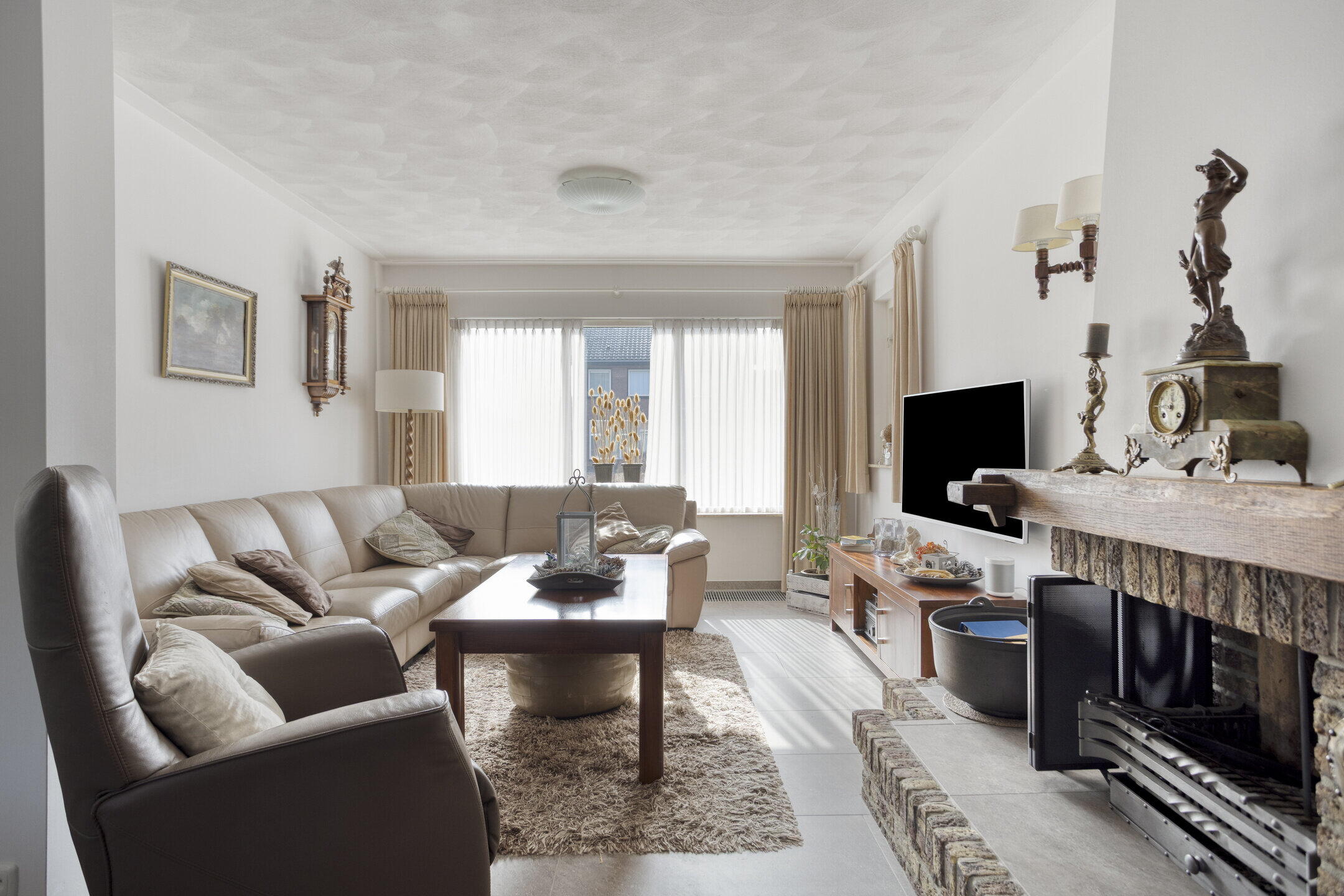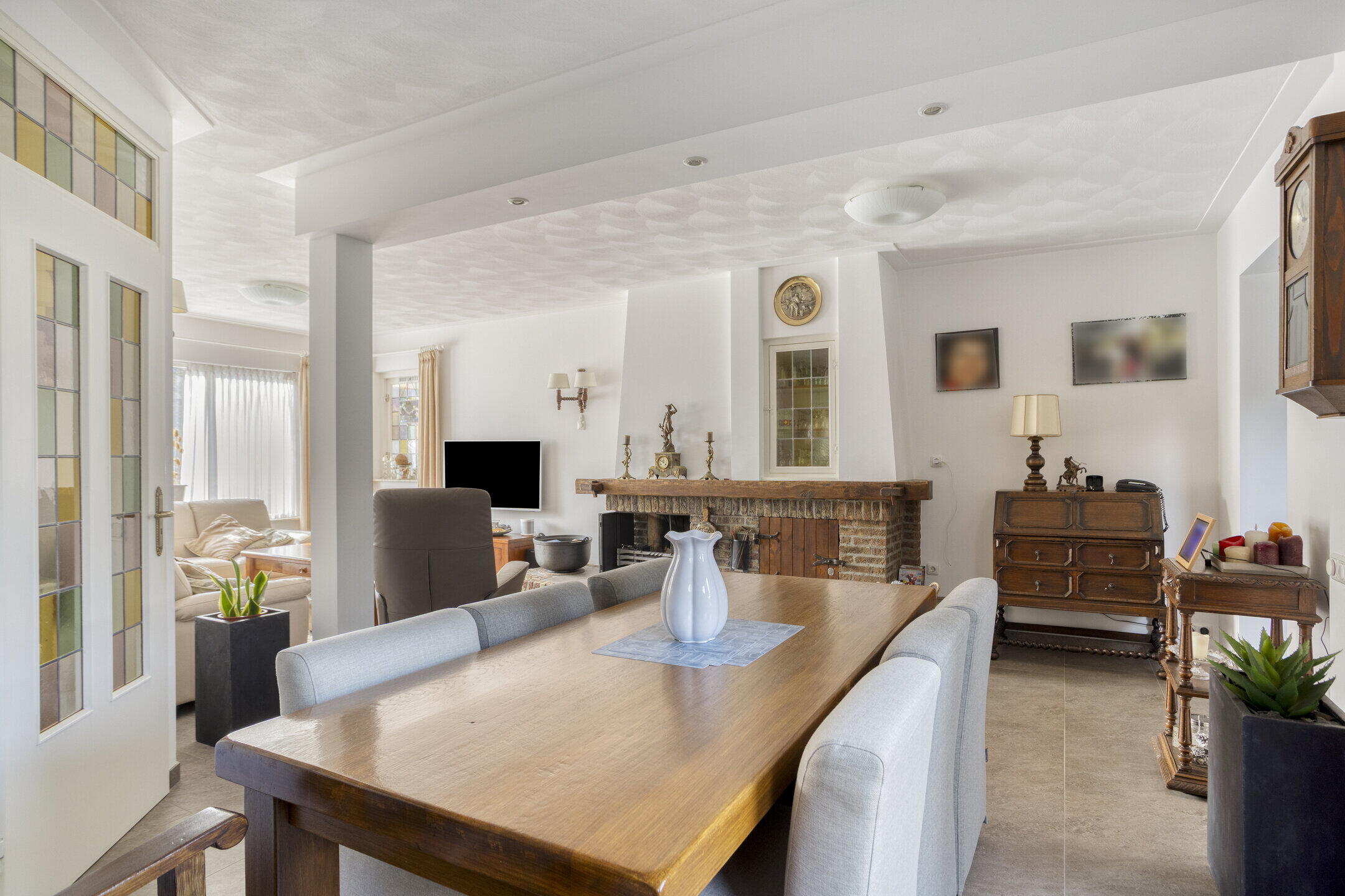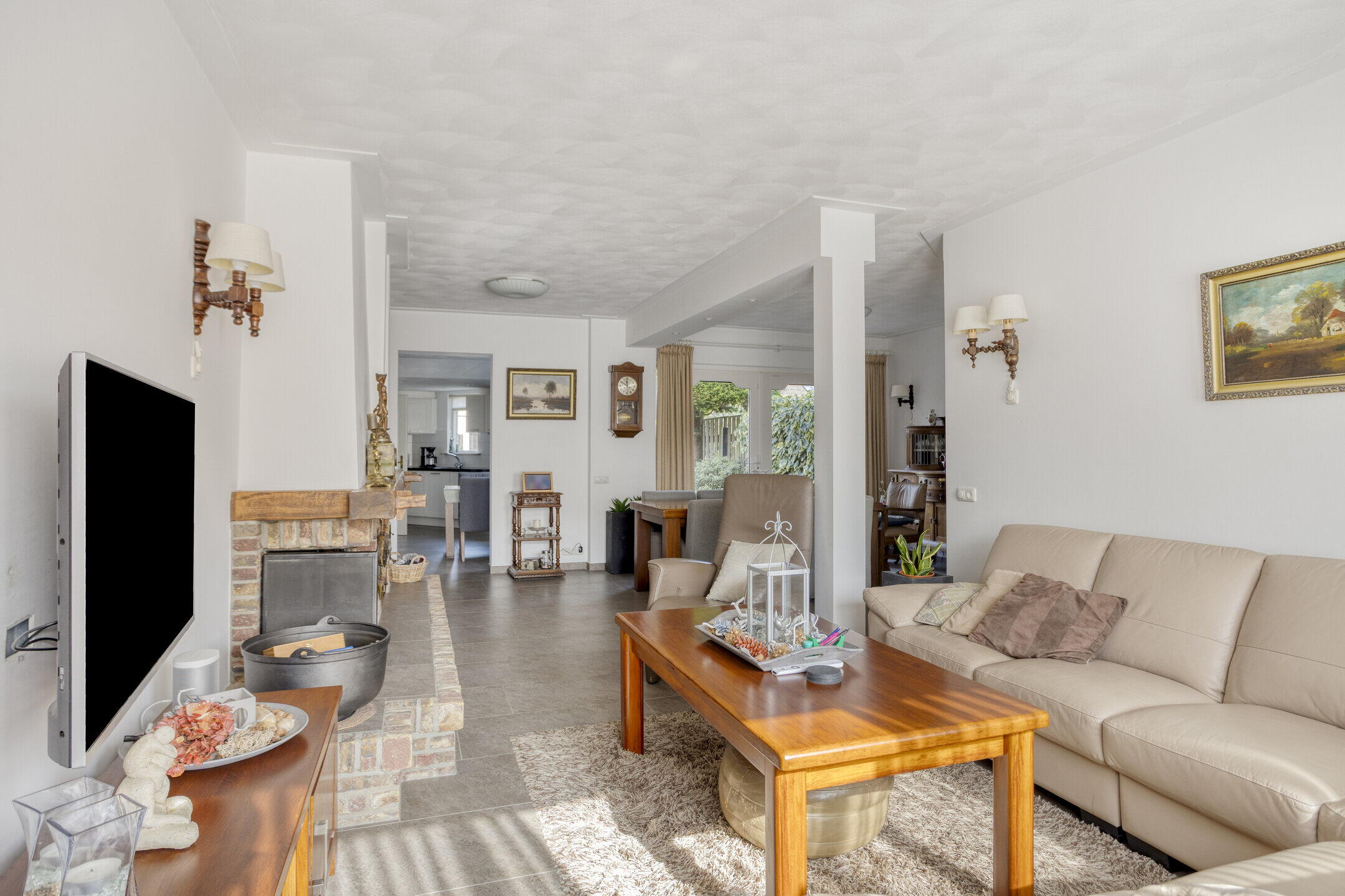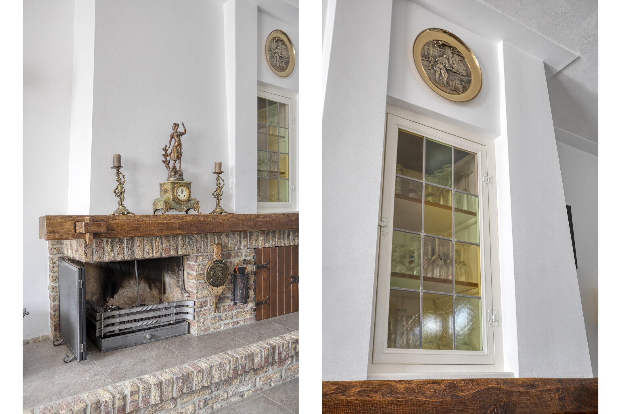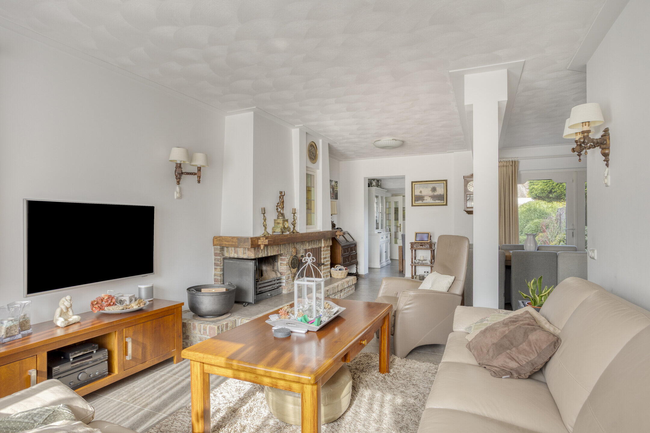 Royale hal met meterkast, vaste kast, nette toiletruimte met fontein en trapopgang. Vanuit de hal toegang tot de woonkamer. De woonkamer is opvallend licht dankzij de grote ramen en biedt ruimte voor een royale zithoek rondom de open haard. Aan de achterzijde is er een fijne plek voor een grote eettafel bij de tuindeuren, waardoor een prettige verbinding met de tuin ontstaat. De tuindeuren zijn voorzien van een elektrisch rolluik.