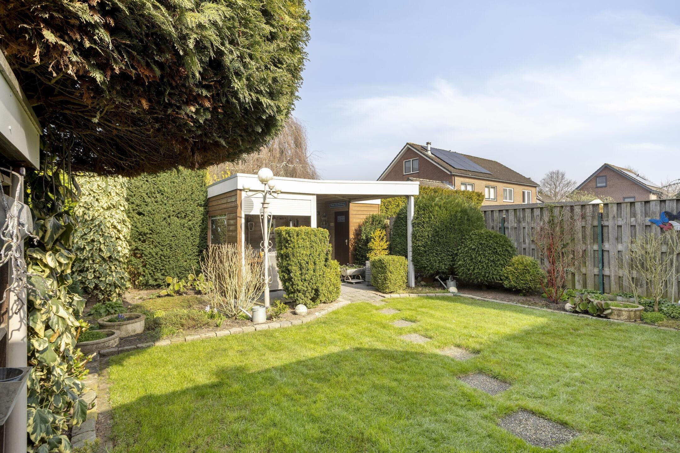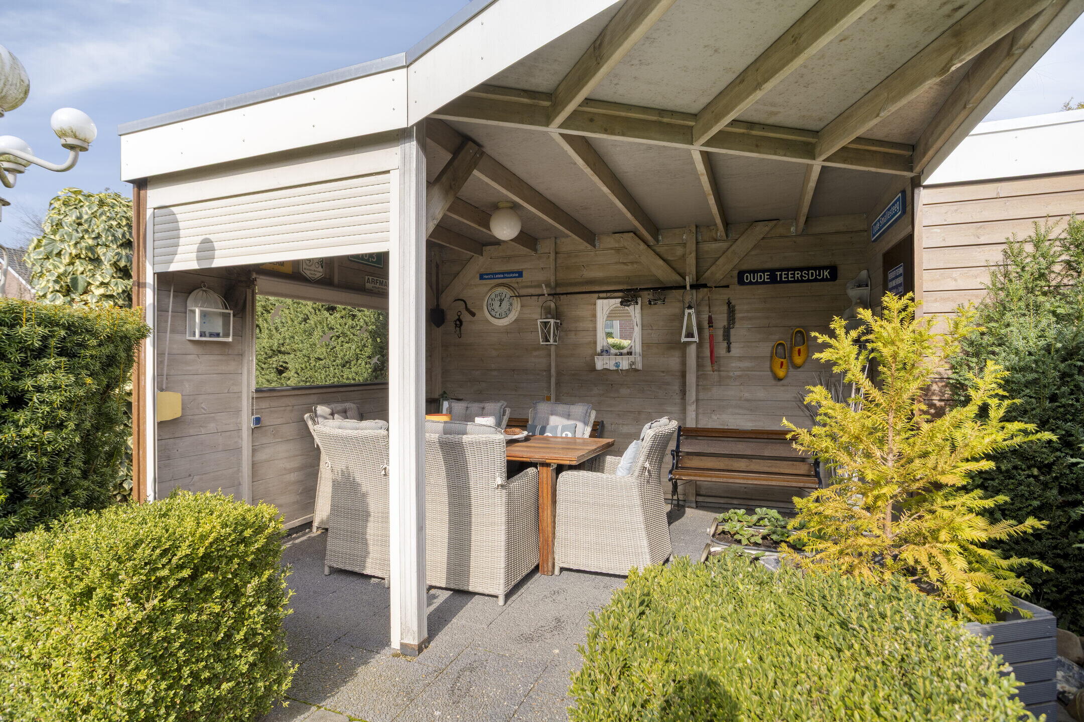 Achter in de tuin bevindt zich een overkapping waardoor je hier ook bij minder weer comfortabel buiten kunt zitten en het buitenseizoen eenvoudig kunt verlengen.